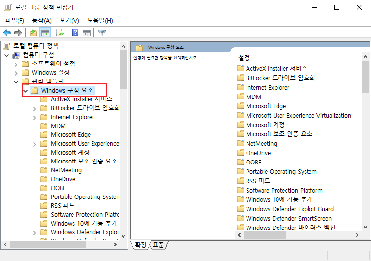 2. '로컬 그룹 정책 편집기' 창에서 아래 항목으로 이동합니다.