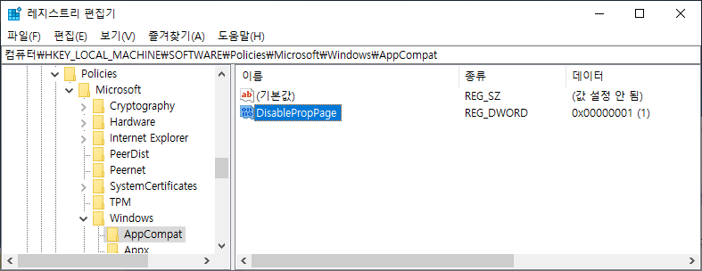 키 : HKEY_LOCAL_MACHINE/SOFTWARE/Policies/Microsoft/Windows/AppCompat