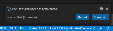 Hello. While editing on VS code, my dart analyzer terminates frequently. I've tried some solution found in other issues and none of them works. How can I fix it? Here is my flutter doctor resul...
